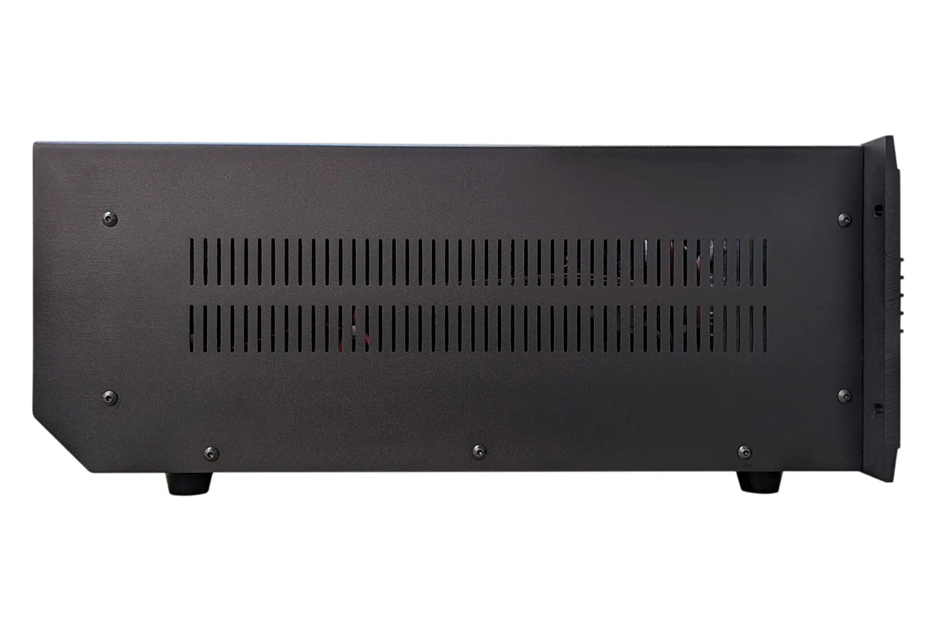 The ConCurrent power supply design ensures full power can be delivered at all times to all channels simultaneously. Earthquake engineers developed the parallel symmetric transformer with identical electromagnetic coupling for each secondary winding. Every channel has its own secondary winding, capacitor bank, rectifiers and output circuitry all mounted on massive, individually, vertically-ripped extruded aluminum heat-sinks. The individual channels remain sovereign and autonomous as sharing is not required. This guarantees that no matter how hard one channel is driven it will have no effect on surrounding channels.