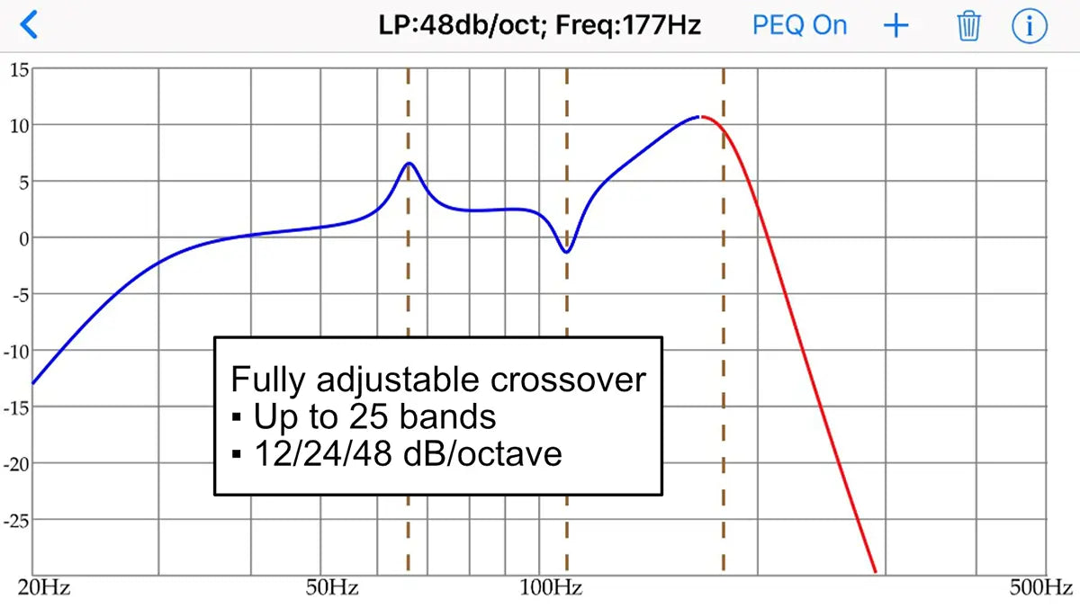 In order to optimize sound and clarity on a subwoofer, it must be tuned properly to its environment. Through an automated room correction process that the iWoofer™ Pro app offers, you will get the customized performance that you deserve and achieve the maximum amount of SPL and a more linear response for your home theater. Up to a 48dB/octave crossover is also available within the application for a steep frequency cutoff.