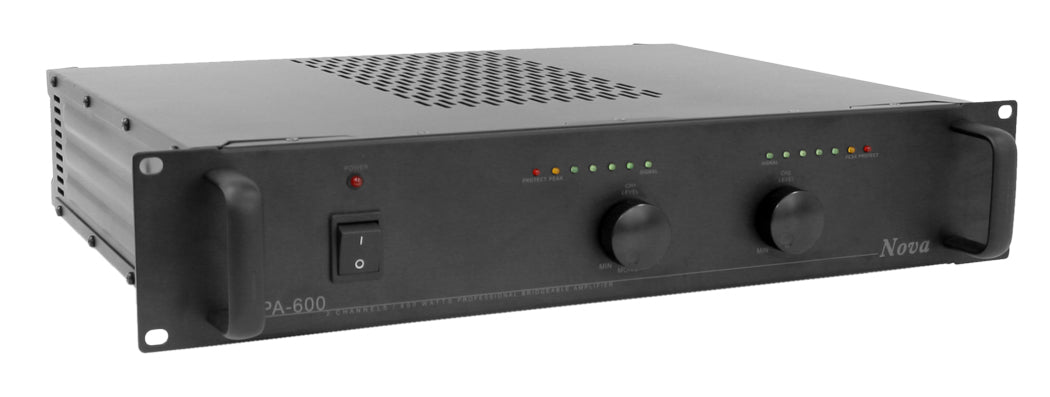 Nova PA600 is equipped with extensive protection and instrumentation. Instrumentation provides real-time insight into the amplifiers operation. Dual VU meter with five green LEDs per. channel shows the current output power. A peak indicator circuit activates a yellow LED (per channel) when the amplifier's output stage is within 1 dB of full power. When overdriven the amplifier's intelligent anti-distortion circuit will subtly reduce volume. It enables the user to use the amplifier's full power without concern for distortion. This means that the amplifier can run at its absolute max limit continuously.