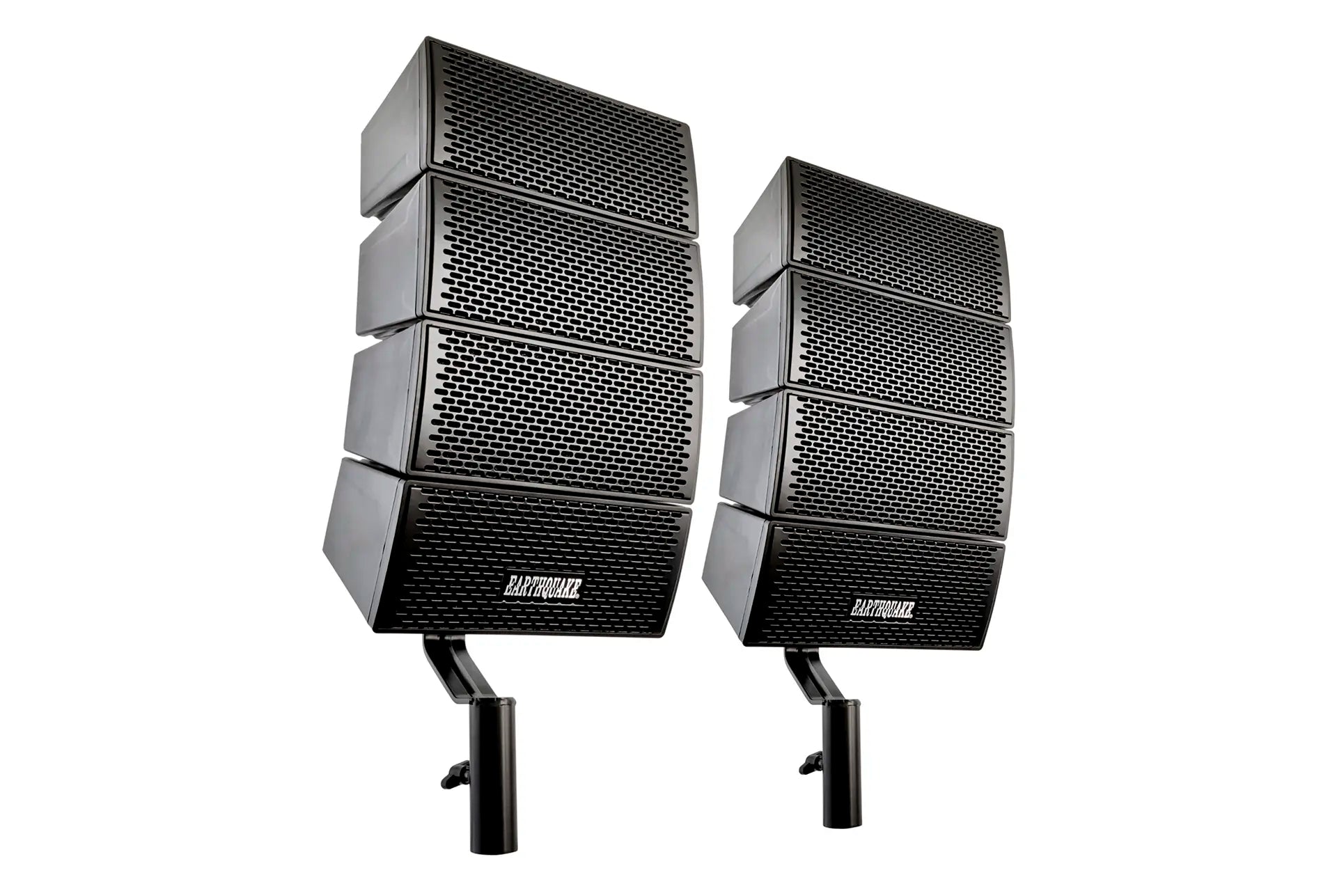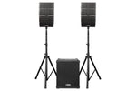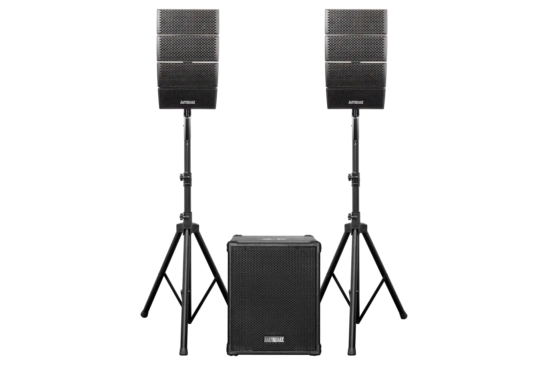 DJ-Quake-2.1-V2 is a portable speaker system that consists of two 4 x 4-inch array speakers (DJ-QUAKE-ARRAYS-GEN2) with stands (2B-ST35M) and one 12-inch subwoofer (DJ-QUAKE-SUB-V2) with a built-in 1200-Watt Max amplifier (600-Watt RMS).
