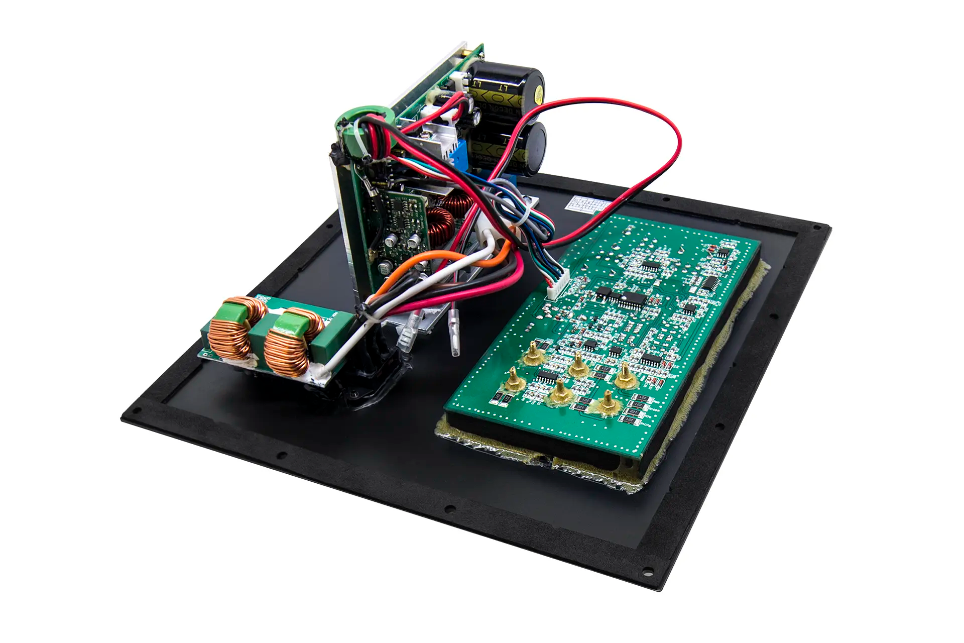 Like the high-end IQ plate amps the BA-550 is equipped with an oversized separate transformer. The separate design reduces the mounting depth thus allowing even smaller subs to be built. The transformer is easily installed in a corner of the cabinet where there is extra space. The transformer is a rigid silicon-steel hard-wound 750VA low regulation toroidal transformer. The large and heavy transformer ensures a stable supply without voltage drop even under heavy load.