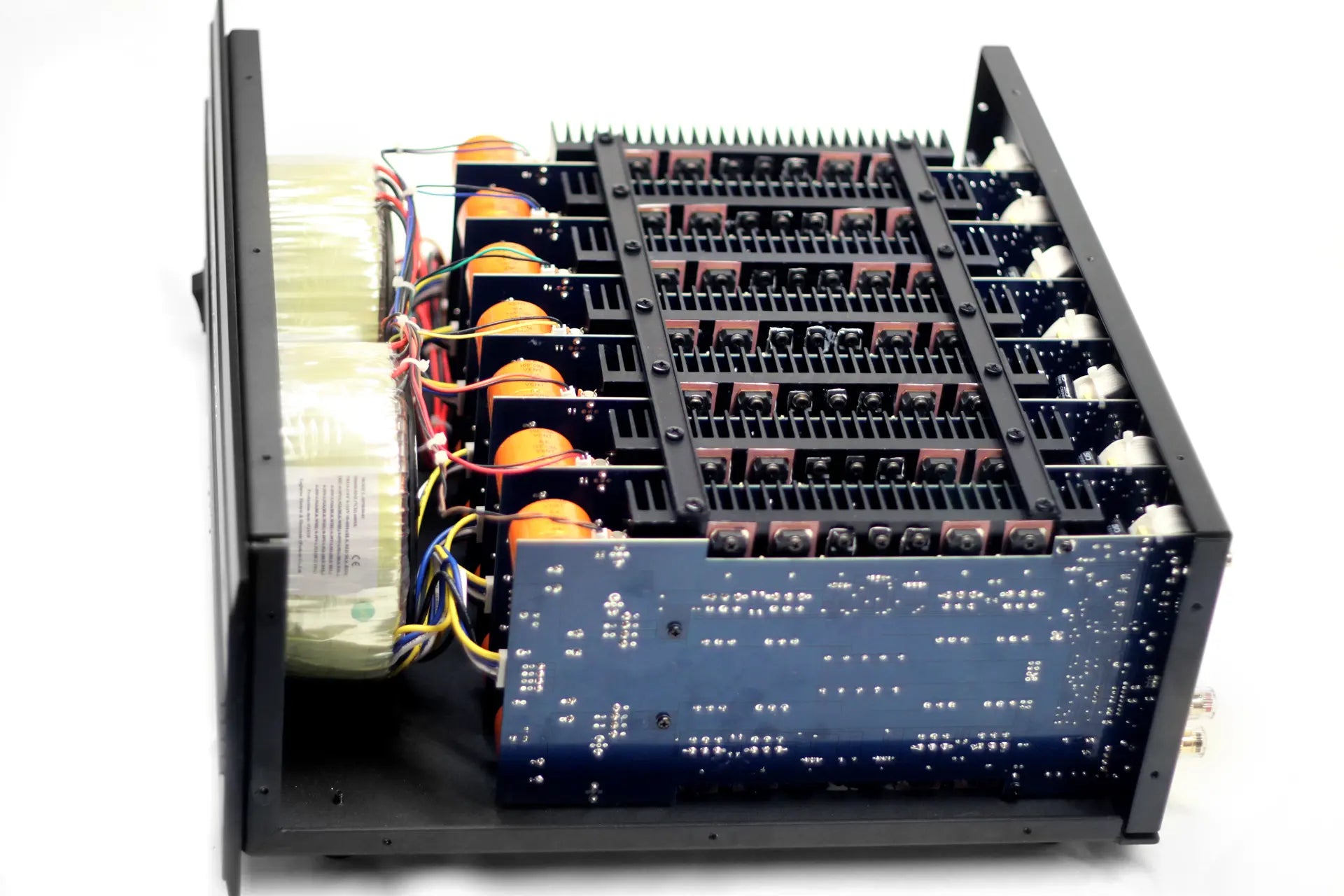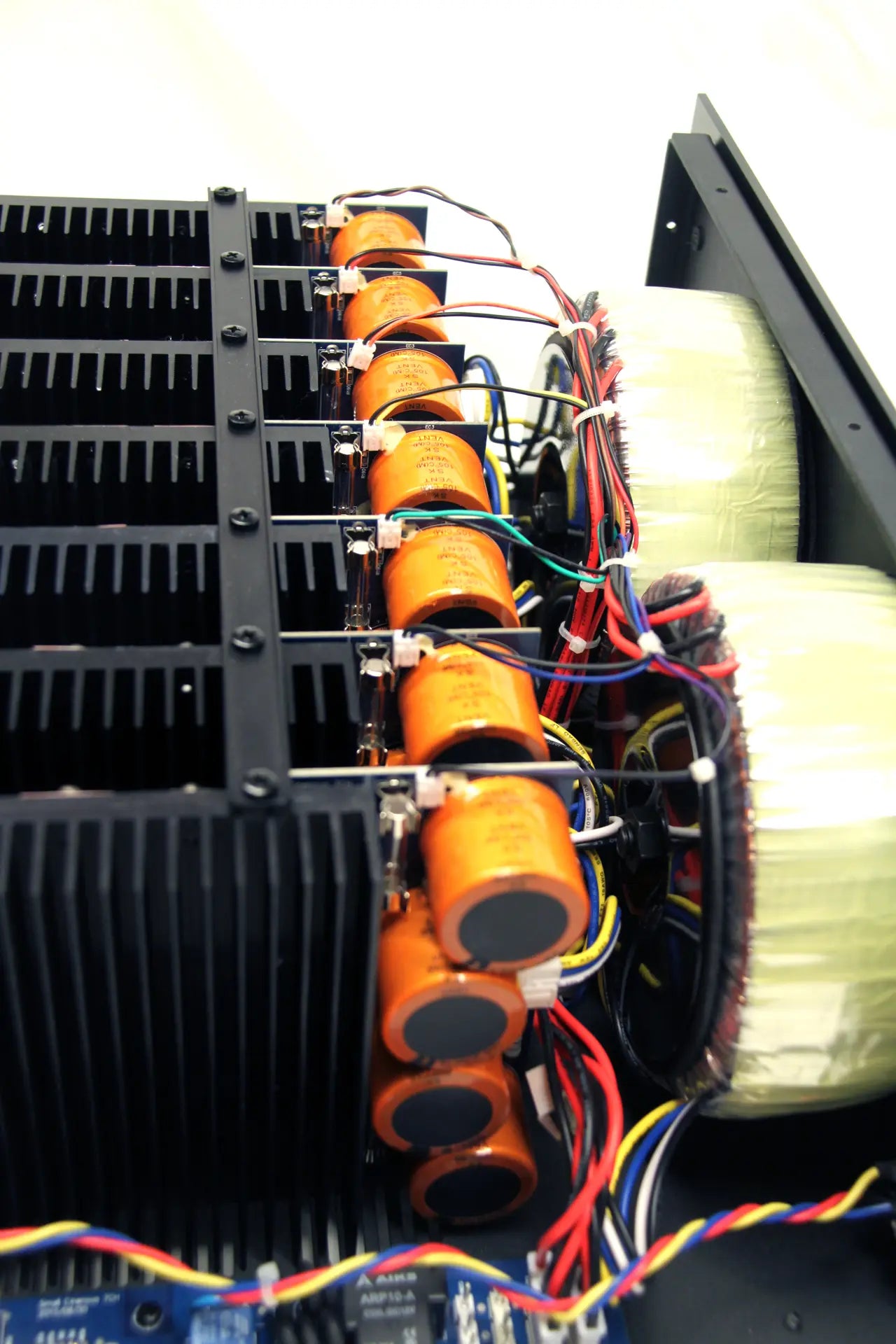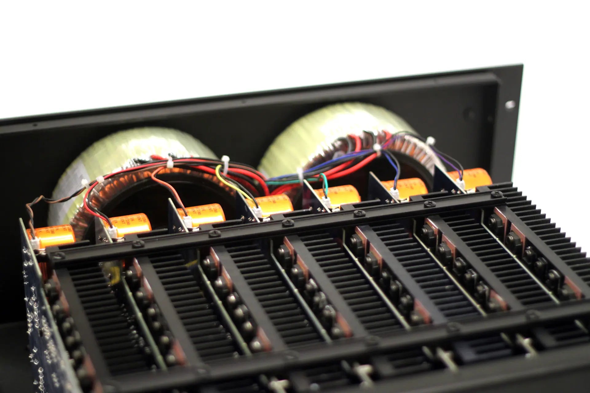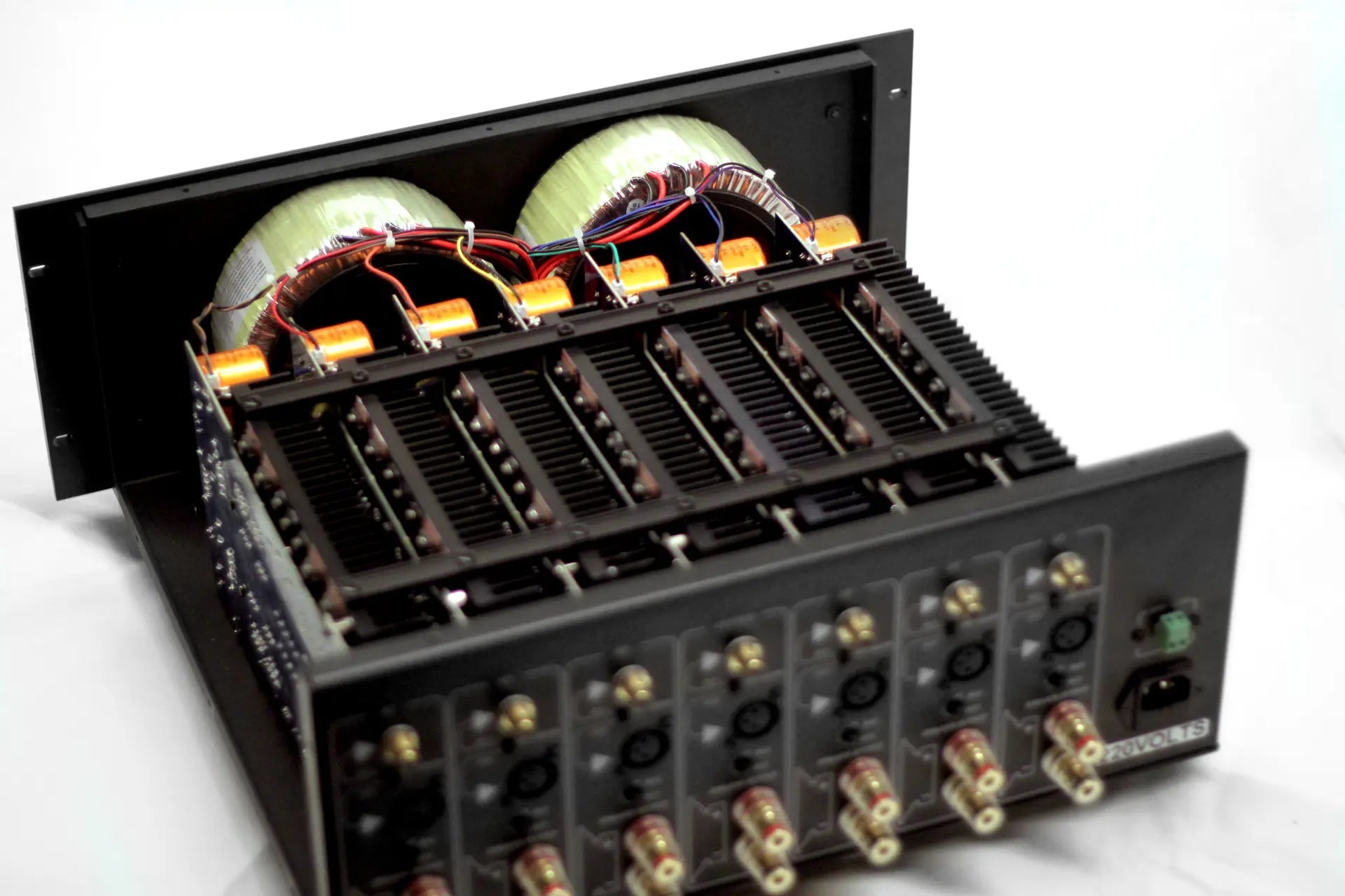 Every channel has its own secondary winding, capacitor bank, rectifiers and output circuitry all mounted on massive, individually, vertically-ripped extruded aluminum heat-sinks. The individual channels remain sovereign and autonomous as sharing is not required. This guarantees that no matter how hard one channel is driven it will have no effect on surrounding channels.