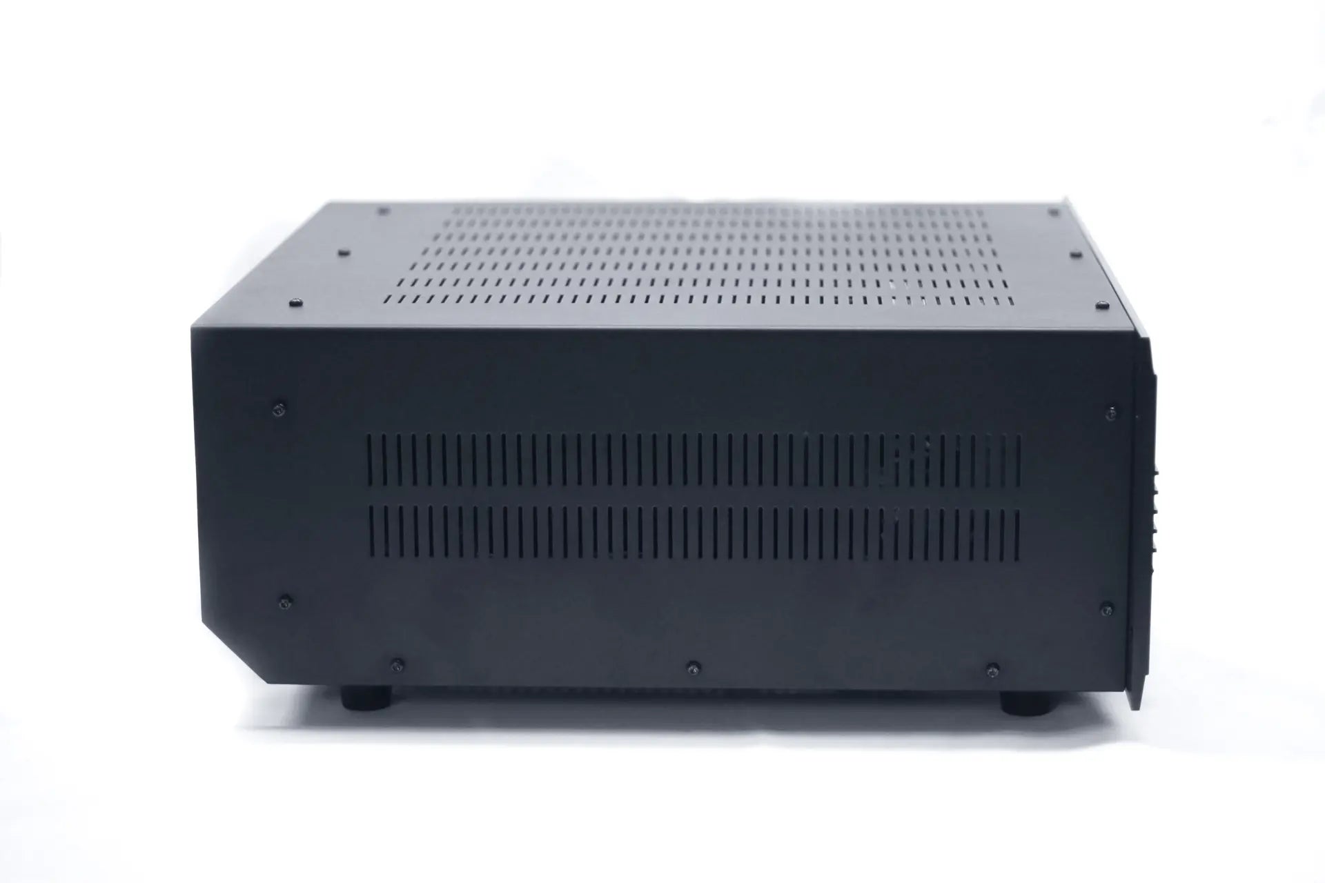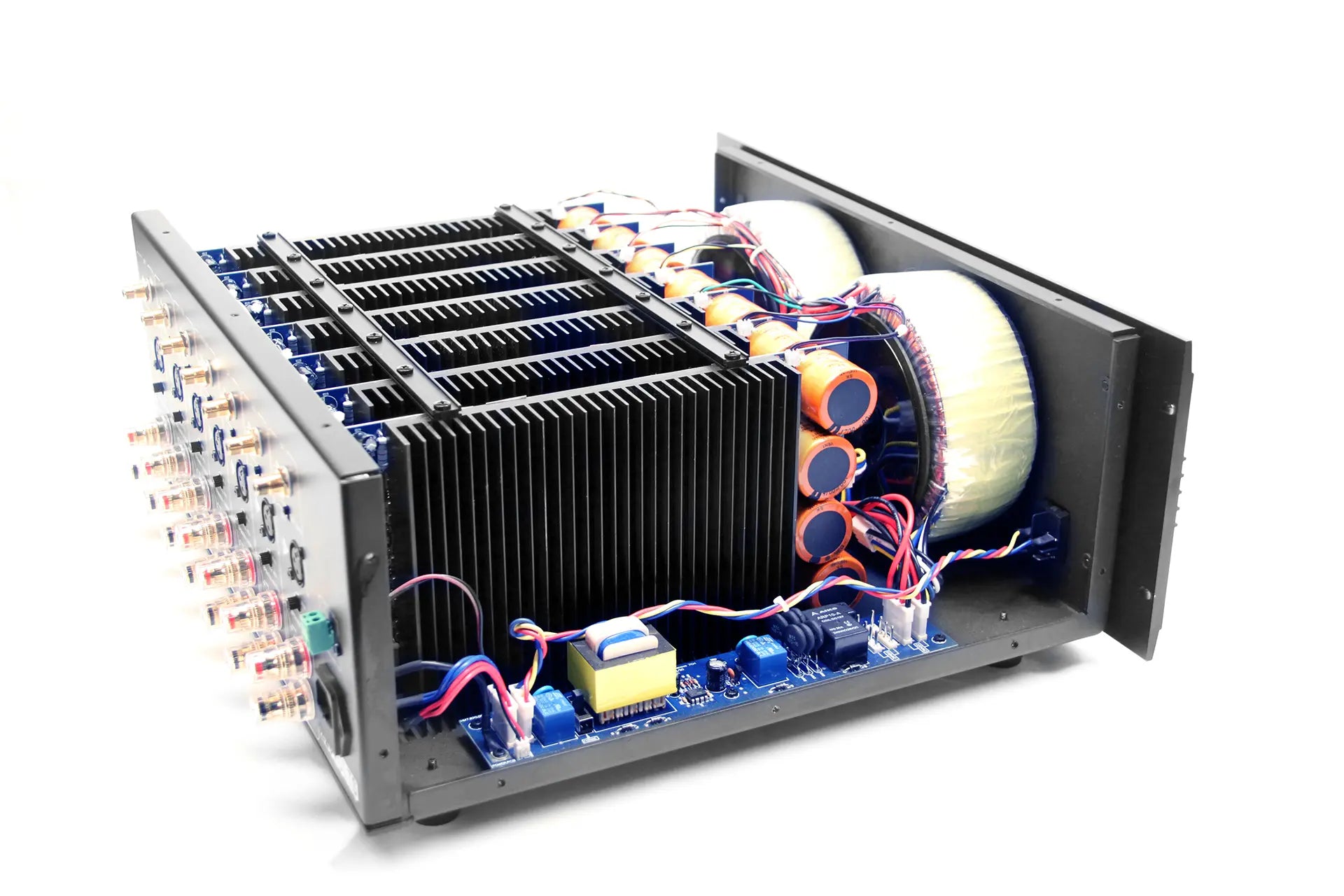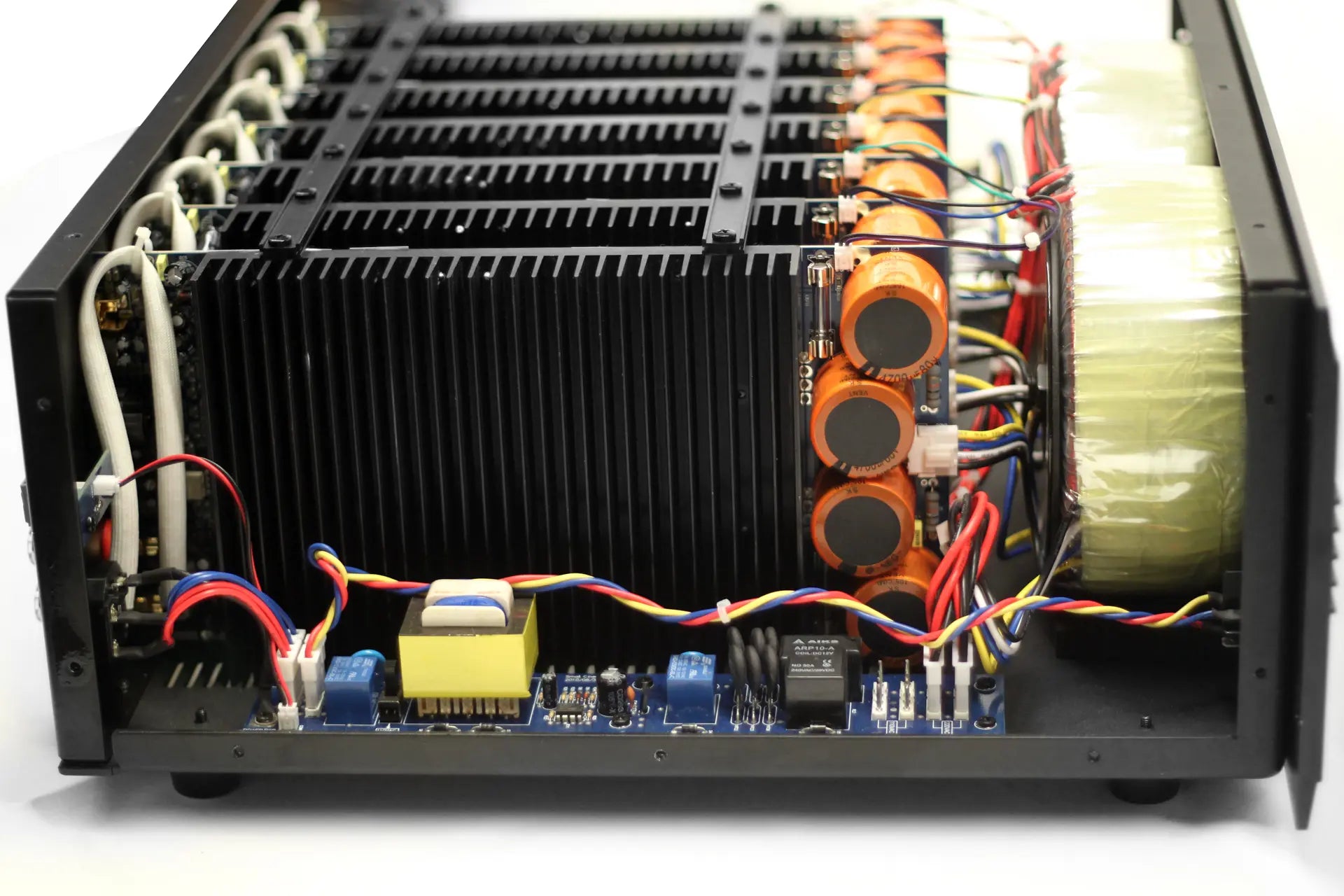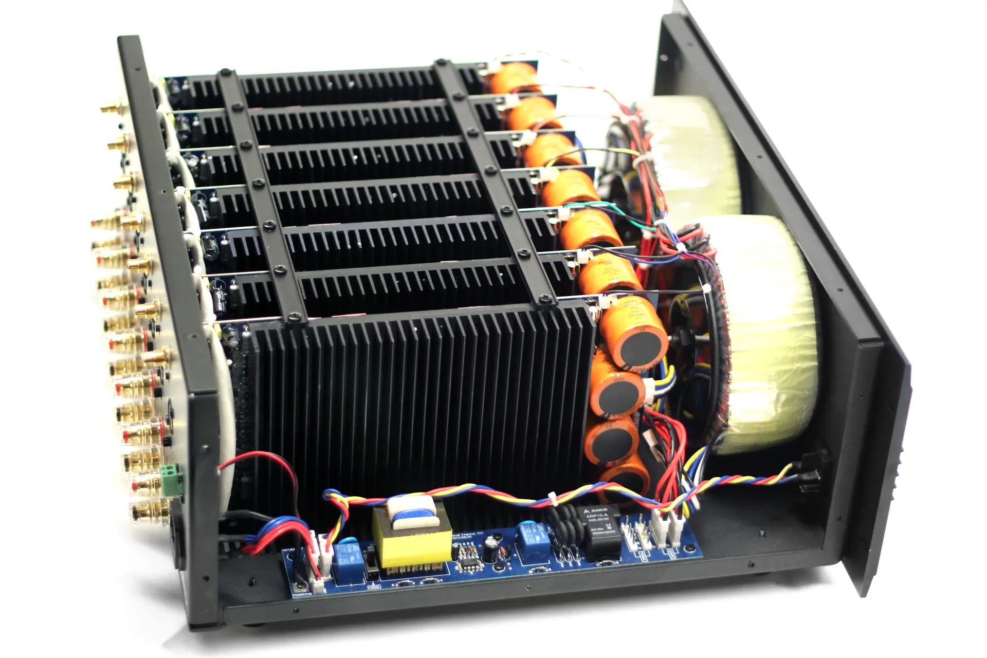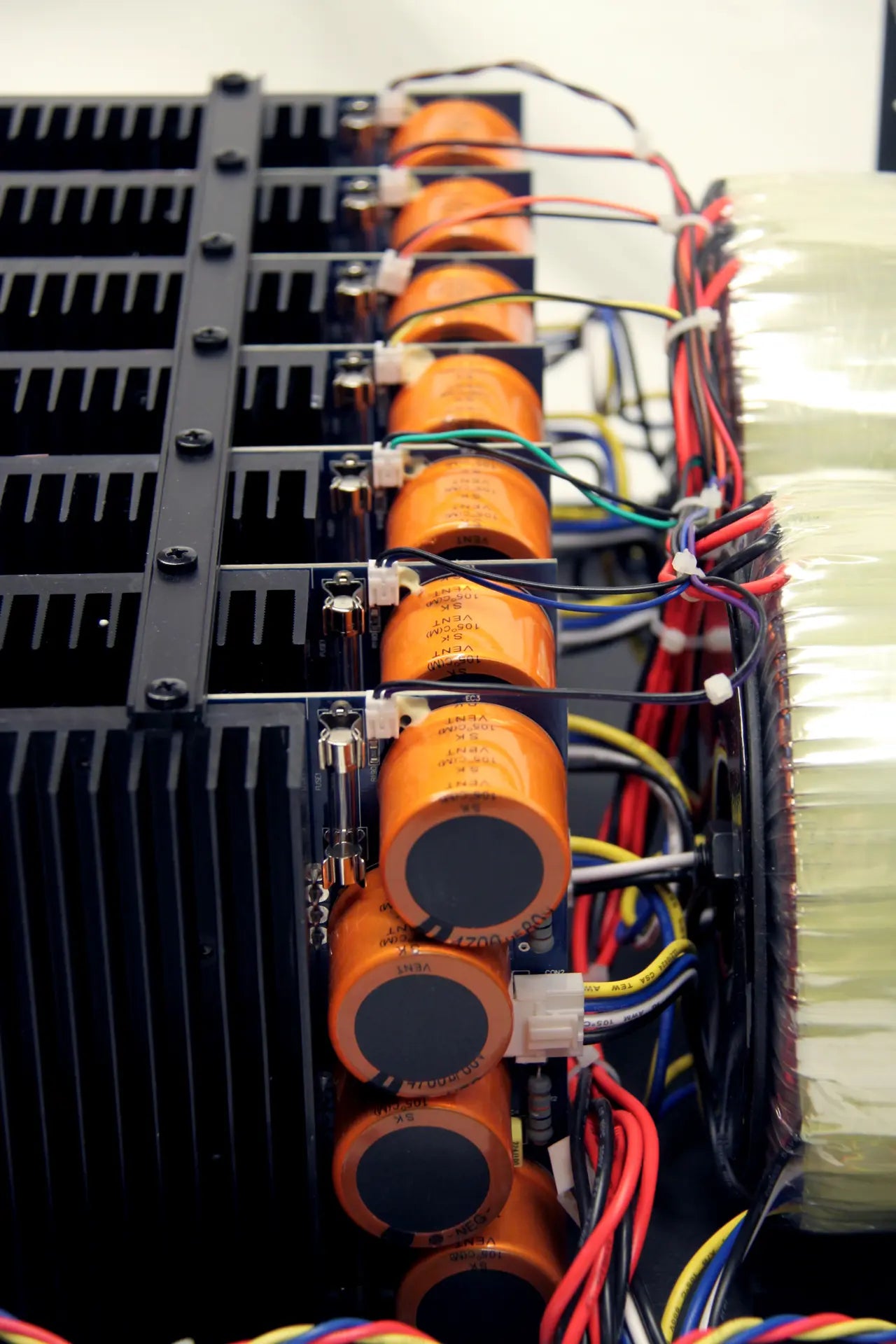 Every channel has its own secondary winding, capacitor bank, rectifiers and output circuitry all mounted on massive, individually, vertically-ripped extruded aluminum heat-sinks. The individual channels remain sovereign and autonomous as sharing is not required. This guarantees that no matter how hard one channel is driven it will have no effect on surrounding channels.