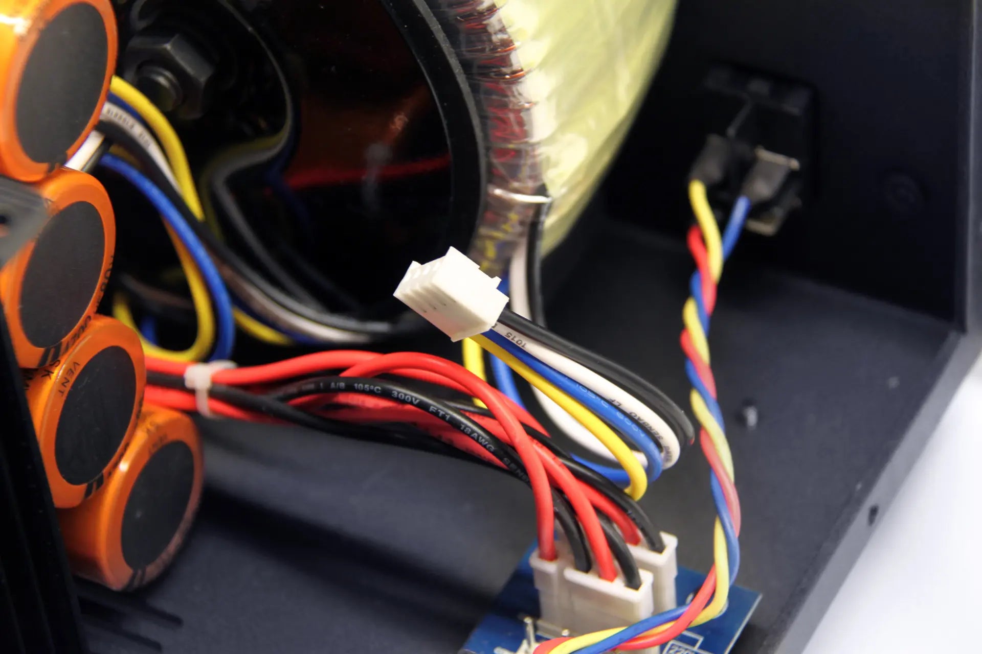 Power supply efficiency, stiffness and strength are dependent on several factors. The ConCurrent design is the culmination of intense optimization of all known parameters. To stiffen the supply (lower regulation factor) the transformer cores are made of ferrite instead of a lower grade iron material. The windings are made with the same oxygen free copper that is used in high-end speaker cables. To ensure a hum-free operation, the transformer is hard-wound and made with military grade high temperature lacquer. The ConCurrent power supply in the Cinénova 7 has a combined transformer rating of 2400VA.