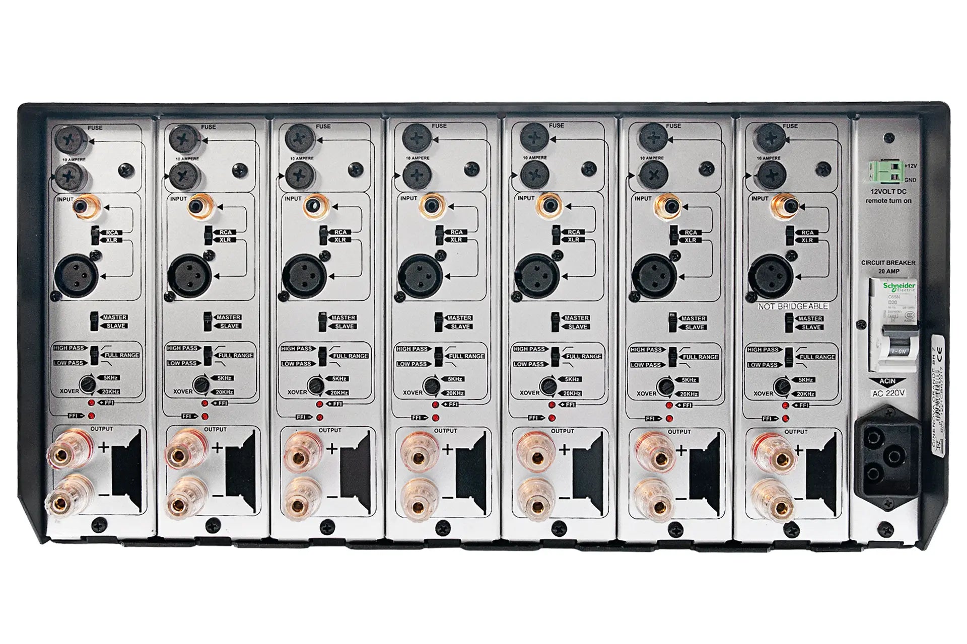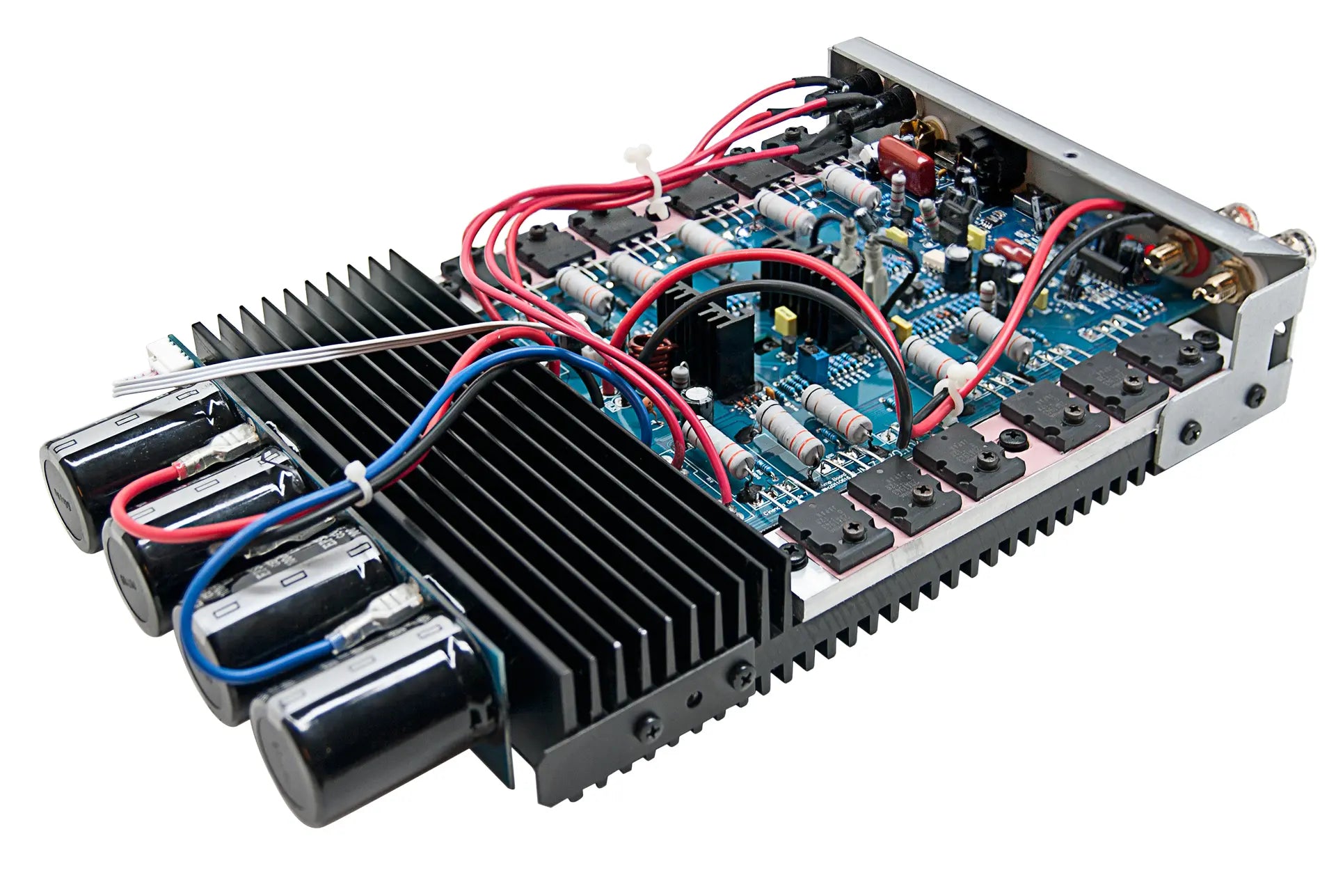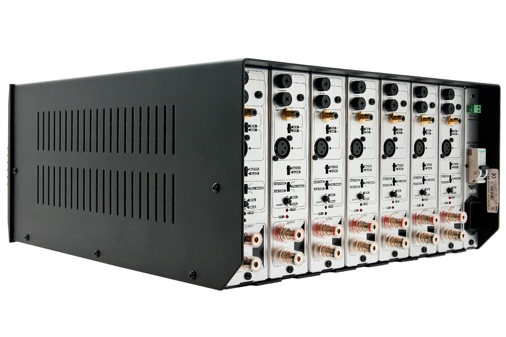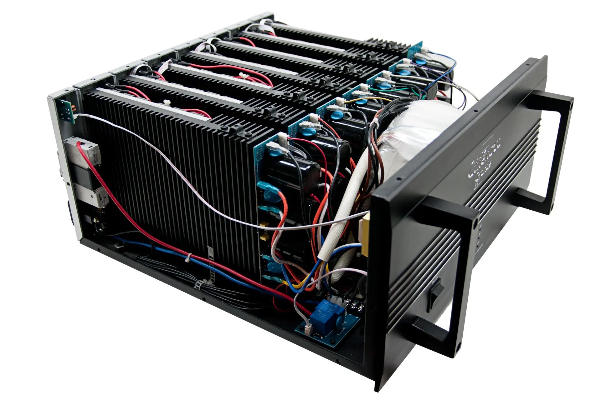 Cinénova Grande BRis comprised of individual amplifier blocks named Alpha One. The Alpha One module blocks work independently of each other – each is a 1000 watt power amplifier itself. Each Alpha One has a 15 amperes supply and is equipped with its own preamplifier and power supply circuits (electrolytes, rectifier, etc.). Alpha One is equipped with 10 ultra-fast, 30 amperes special Toshiba transistors. This armament allows 1000 watts continuous power and 2000 watts transient response.