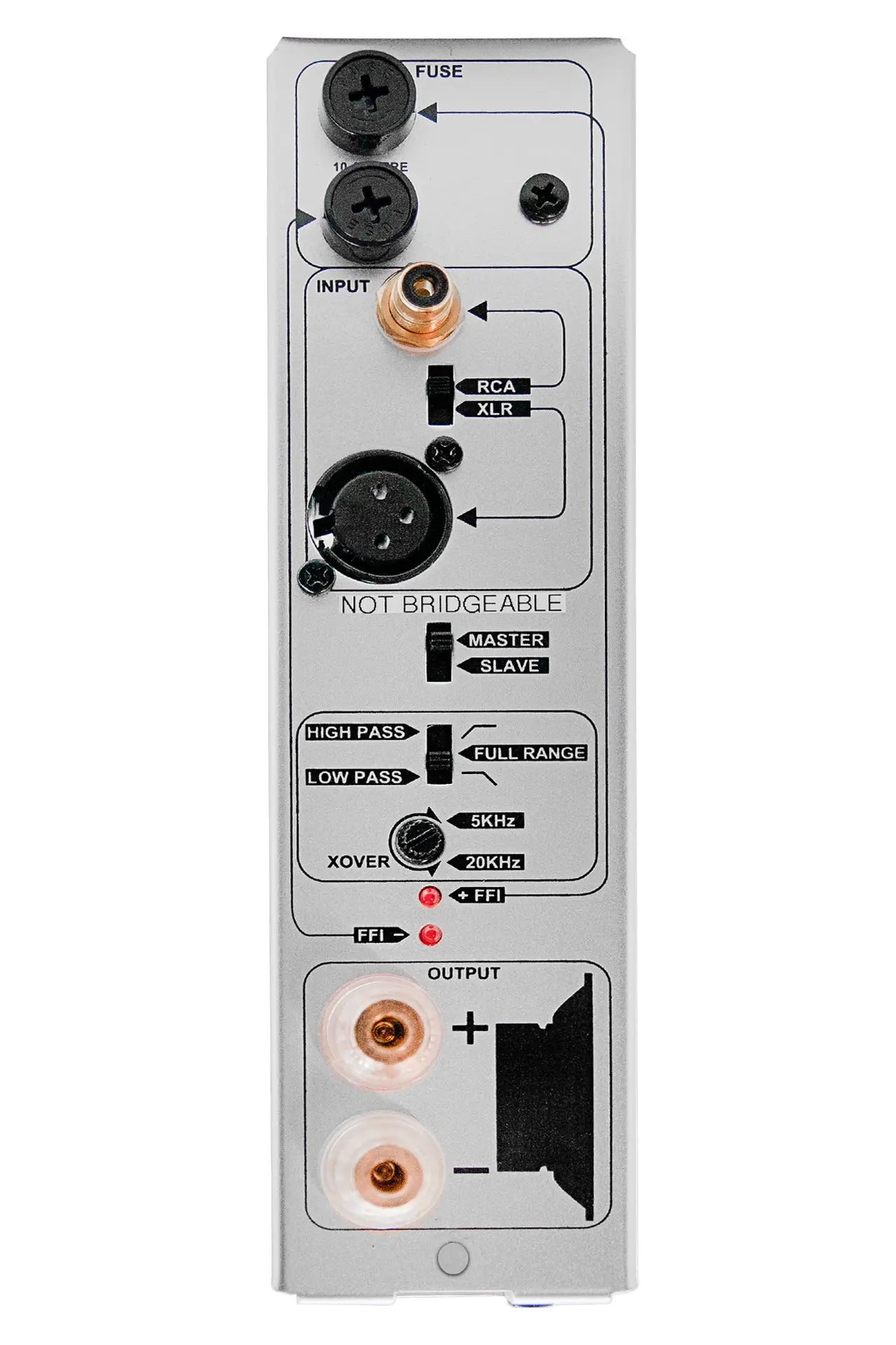 This is a unique feature that allows each channel to be adjusted only to reproduce the user’s desired frequency range. A three-way switch and a potentiometer controls the filter function. If the switch is set to bypass, the crossover is disconnected and has no function and the channel acts as an ordinary mono output channel. If the switch is set to high pass, the channel will only reproduce the higher frequency range. The intersection of the crossover divider can be infinitely adjusted using the potentiometer. When the switch is set to low pass, it will only reproduce the lower frequency area and the intersection is adjusted in the same manner. Crossover function can be a superb tool for the enthusiastic DIYer, who wants to experiment with parts frequencies.