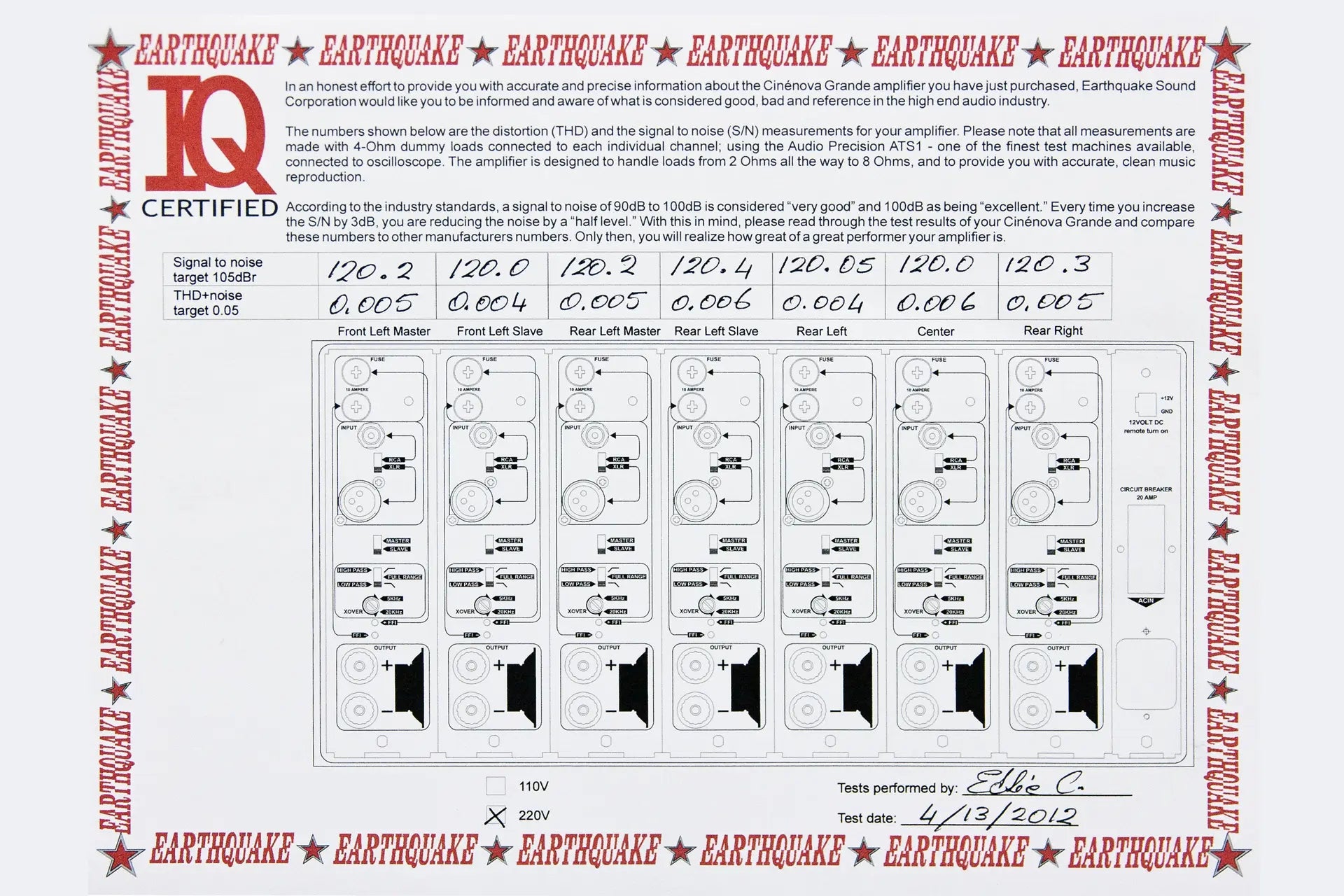 Cinénova Grande is hand built in the USA and undergoes a 24-hour test and burn-in process before it is measured and approved for sale. Each amplifier is supplied with its own individual data sheet, where the amplifier's exact measurements are applied, and the name of the technician who performed the measurements. This is proof of performance and ensures that the amplifier lives up to our promise of guaranteed excellence.