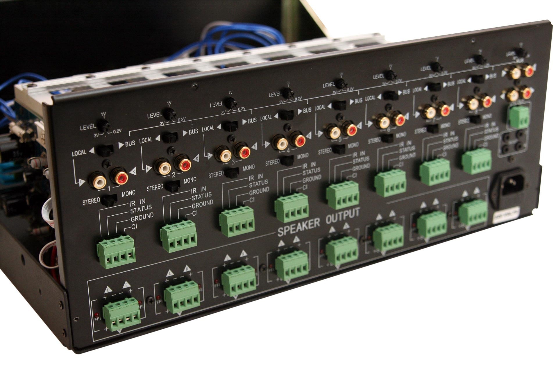 RCA inputs for all eight zones are located on the rear panel. A power-bus system handles zones that share the same input. Each zone can have two (2) pairs of 8-Ohm speakers or one (1) pair of 4-Ohm speakers.