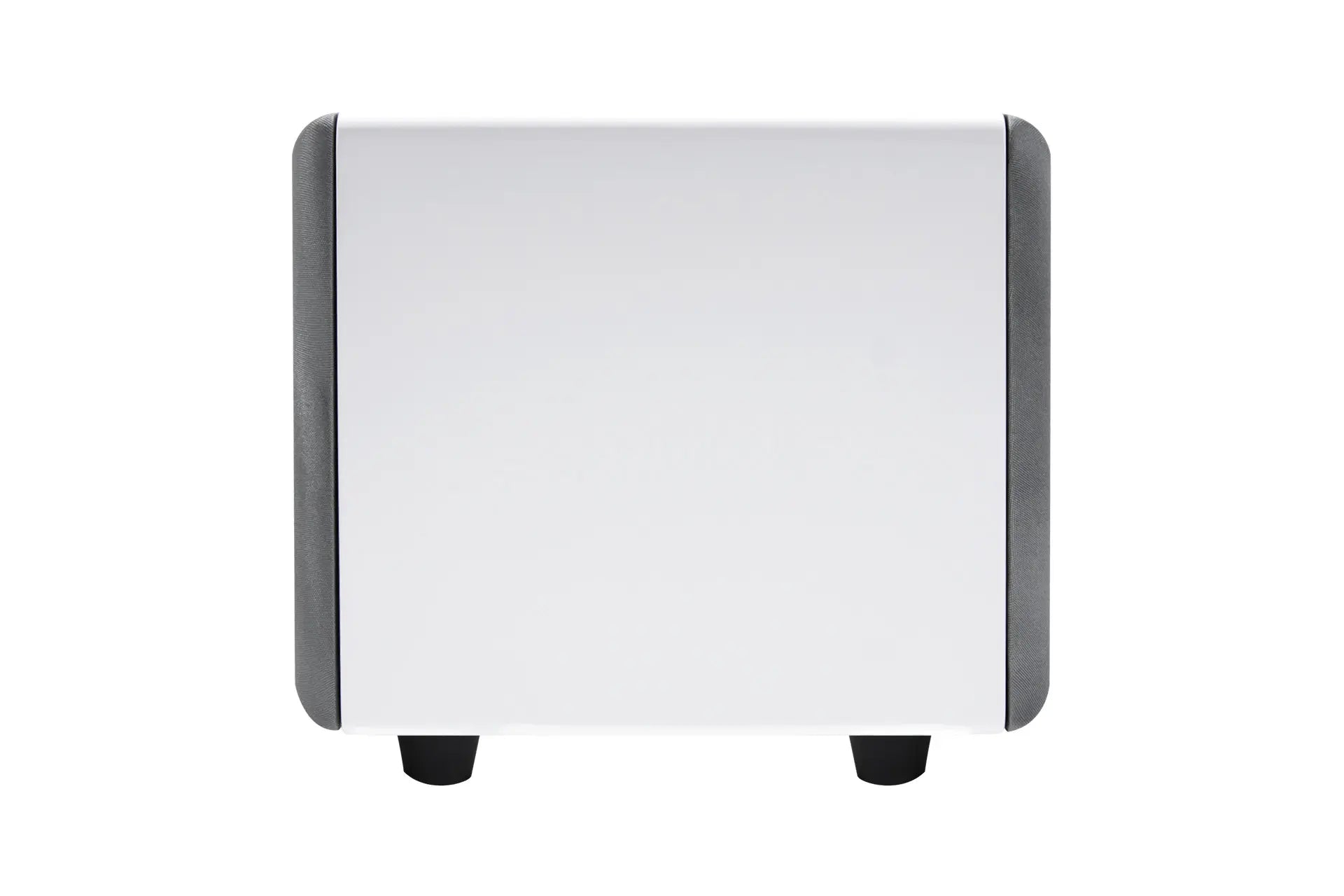 The MiniMe DSP P8 is covered in deep luxurious black or white piano lacquer. The cabinet finish begins with a thorough sanding and priming followed by multiple applications of lacquer with additional fine sanding between layers. The cabinet is then finished with a smooth, high gloss clearcoat. The elegant piano lacquer complements its compact modern design and adds sculptural finesse and exclusivity to your home.