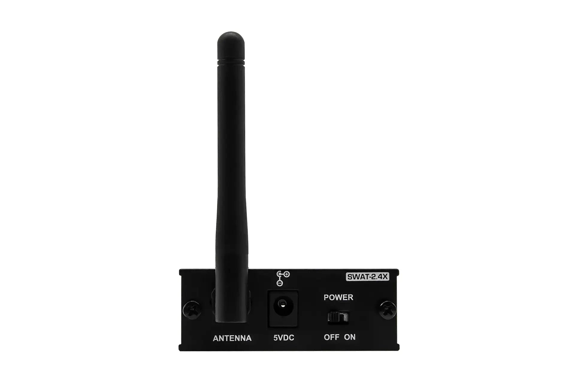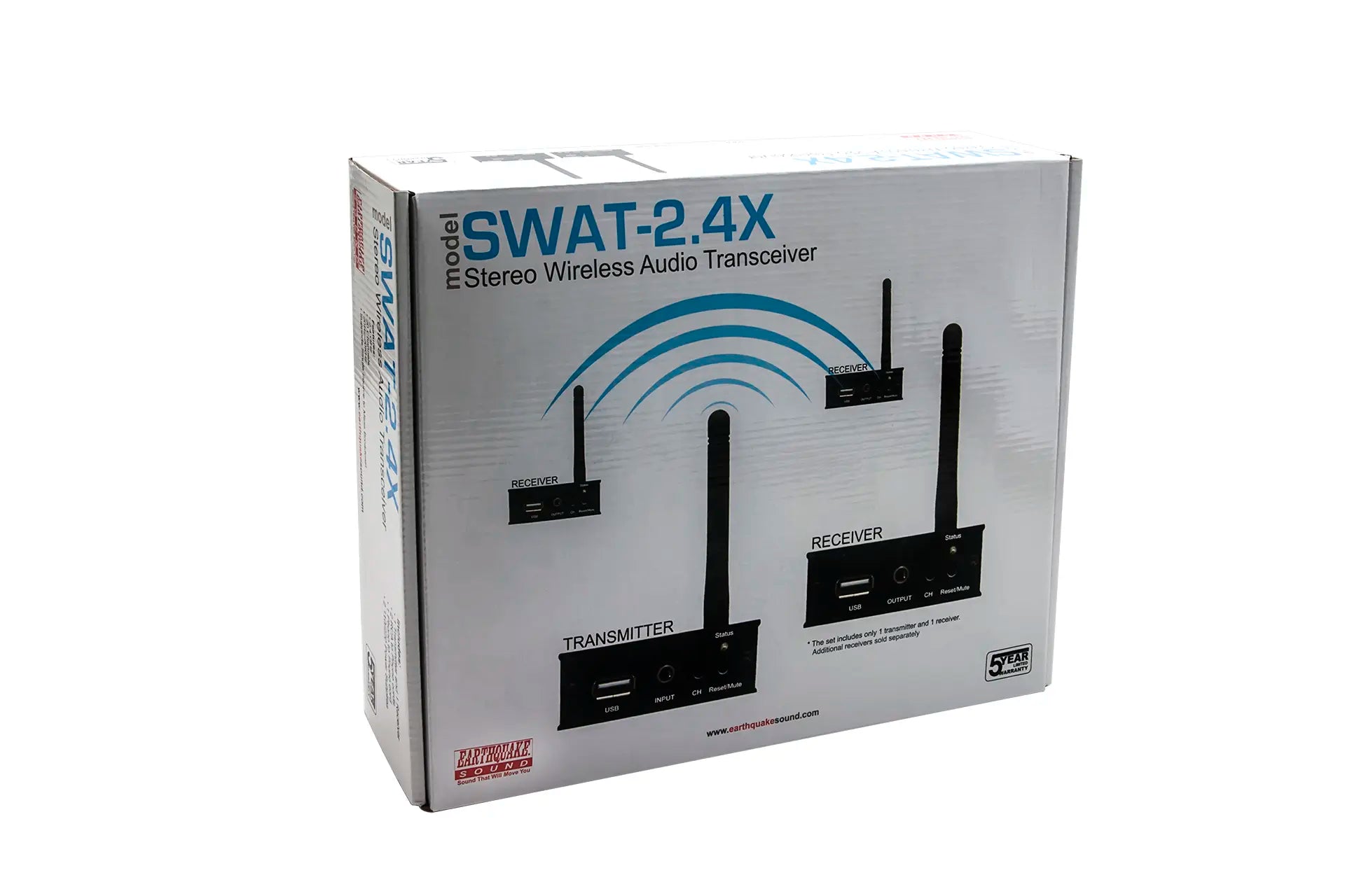 SWAT 2.4X is a wireless audio transceiver that allows you to play audio material from your audio source player to any speaker wirelessly. Hard wiring your speakers to your sound source is costly and time consuming. SWAT 2.4X makes install a snap and does not compromise sound quality for convenience. It is extremely versatile and perfect for apartments or outdoor settings. It even has microphone capability so you can transmit voice as well.