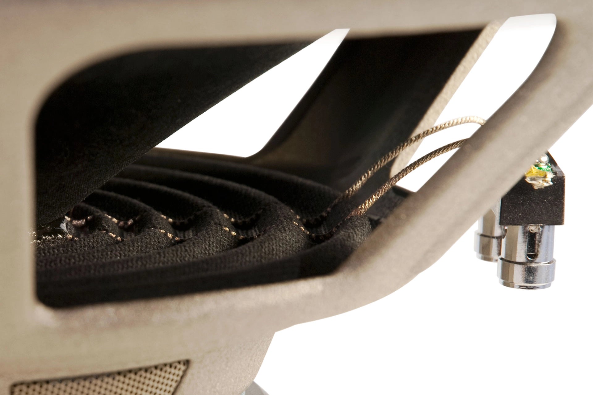 The tinsel leads to the voice coil are sewn into the spider to ensure against collision with the cone during extreme excursion. This also extends the life of the tinsel leads, as they now bend more gently over a longer distance.  The symmetrical design of the tinsel leads prevents an asymmetrical pull on the cone. The result is longer woofer life, and greater endurance.